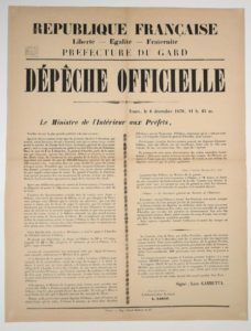 GARD. 1870. BALLON. ARMÉE DE LA LOIRE (SIÈGE D'ORLÉANS) DÉFENSE DE PARIS - DÉPÊCHE OFFICIELLE du Ministre de l'Intérieur Léon GAMBETTA aux Préfets à propos des combats à ORLÉANS et du courrier reçu de PARIS, par le BALLON FRANKLIN, signalant une victoire du Général TROCHU sous Paris - TOURS, le 6 Décembre 1870 - "...à midi, le Général AURELLES DE PALADINES écrivait à ORLÉANS: Je change mes dispositions, je dirige sur Orléans les 16e et 17e corps; j'appelle les 18° et 20°; j'organise la résistance, je suis à Orléans. ...M. le Ministre de la guerre voulut se rendre lui-même à Orléans...J'avais espéré jusqu'au dernier moment pouvoir me dispenser d'évacuer Orléans; tous mes efforts ont été insuffisants. Cette nuit la ville sera évacuée, signé FREYSSINET...L'ennemi a proposé notre évacuation à Orléans, à 11 heures et demie du soir, sous peine de bombardement de la ville...J'ai accepté au nom du général en chef. Les batteries de la Marine ont été enclouées, les poudres et le matériel détruits...on est sans nouvelle du Général AURELLES..." pour copie conforme L. LAGET - NÎMES, Impr. Typ. CLAVEL-BALLIVET. Affiche (65 x 49) État A