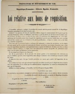 VAR. « LOI relative aux BONS DE RÉQUISITION. » (au sujet des Indemnités des réquisitions fourni ou livré aux Troupes françaises depuis le commencement de la Guerre) – Jules GRÉVY le Président, les Secrétaires Paul Bethmont, Marquis de Castellane, Vicomte de Meaux, Paul de Rémusat, Baron de Barante. A. THIERS Président du Conseil, chef du Pouvoir Exécutif – Pour notification DRAGUIGNAN, le 17 Juillet 1871 - Impr. à DRAGUIGNAN, chez C. et A. LATIL. Placard (56 x 45) État A.