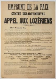 « EMPRUNT DE LA PAIX. APPEL AUX LOZÉRIENS. » 1919. Comité départemental. « Chers Compatriotes, Dans un geste d’union et d’apaisement nous venons faire appel à votre esprit de solidarité et à vos sentiments patriotiques. Ce n’est pas en vain que M. le Président POINCARÉ aura dit son dernier message : … Il faut que l’Emprunt de la Paix, destiné à permettre à la France de recueillir les fruits de la Victoire, ait un succès comparable à celui de l’Emprunt de la Libération qui dépassa 21 milliards. Les Membres d’honneur ; M. de LAS CASES Sénateur, M. DAUDÉ Sénateur, Maire de Mende, M. de CHAMBRUN Député, M. BONNET DE PAILLERETS Député, M. BRUNGER Député, … Membres d’Honneur : Comités de l’Arrondissement de Mende, de Marvejols et de Florac (liste nominative) – Imp. A MENDE, chez Ignon-Renouard. Affiche (89 x 63) État B