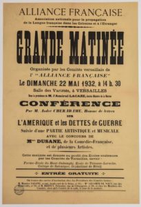 VERSAILLES (78). « Grande Matinée organisée par les Comités Versaillais de l’ALLIANCE FRANÇAISE, le 22 Mai 1932, sous la présidence de M. l’Amiral LACAZE, ancien Ministre de la Marine – Conférence sur l’Amérique et les Dettes de Guerre suivie d’une partie Artistique avec Mme DUSANE de la Comédie-Française. Au profit de la Ferme Ecole du Haut-Oubanghi, École de Téhouan-Larache, Collège de Salonique, Orphelinat de Bitolj. » – « Association Nationale pour la propagation de la Langue français dans les Colonies et à l’Etranger. » - Impr. J. Aubert, Av. de Sceaux, Versailles – Affiche (59 x 40) Etat A