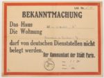 JUIN 1940 « APPEL A LA POPULATION FRANÇAISE » - Le territoire français, occupé par les troupes allemandes, est placé sous l’administration militaire allemande … que chacun reste à son poste et continue son travail. Ce sera pour lui la meilleure façon de servir sa patrie, son peuple et lui-même. » Le Commandant en Chef de l’Armée : (une des premières affiches françaises sous l’occupation allemande en Juin 1940 (59 x 42) État A + On joint ; Document allemant « Bekanntmachung. Der Kommandant der Stadt PARIS, 1941. »