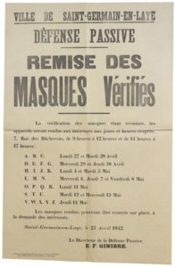 «VILLE DE ST GERMAIN-EN-LAYE (78) en 1942 - 4 Affiches (49 x 32) sur la Défense passive à st-Germain-en-Laye pendant l'Occupation, Le Maire, Chevalier de la Légion d'Honneur, Jean SEIGNETTE; savoir: «Avis à la Population, par ordre des Autorités d'occupation le contrôle de l'obscurcissement sera effectué désormais par l'aviation, qui constatera les infractions par photographies... Des sanctions extrêmement sévères sont prévues contre quiconque n'aura pas assuré un camouflage absolu.» 1er Janvier 1942; Avertissement à la Population en cas d'alerte...» 21 Mars 1942; «Vérification des Masques (à Gaz)» 3 Avril 1942; «Remise des Masques vérifiés.» 25 Avril 1942, - - Les quatre de l'Imprimerie MIRVAULT, Saint Germain en Laye - État A
