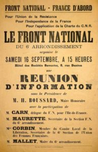PARIS 6e. 1944. «FRONT NATIONAL - FRANCE D'ABORD. Pour l'Union de la Résistance, Pour l'Indépendance de la France, Pour l'application de la Charte du C.N.R. (Conseil National de la Résistance) - LE FRONT NATIONAL du 6è Arrondissement organise le 16 Septembre, Hôtel des Sociétés Savantes, 8 rue Danton, une réunion d'information sous la présidence de M. H. Boussard Maire honoraire...» - Impr. administrative centrale, 8 rue de Furstenberg, Paris - Affiche (62 x 41) État A