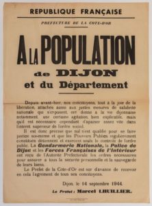 (LIBÉRATION DE LA CÔTE D'OR) Marcel LHUILLIER Préfet de la CÔTE D'OR, «à la Population de DIJON et du Département.» - DIJON, le 14 Septembre 1944 - «Depuis avant-hier, nos concitoyens, toute à la joie de la Libération, attachés aussi aux justes mesures de salubrité nationale qui s'imposent, ont donné à la vie dijonnaise notamment, une certaine agitation, bien explicable, mais qu'il est nécessaire cependant d'apaiser assez vite dans l'intérêt supérieur de l'ordre social. Il est donc précisé que nul n'est qualifié pour se faire justice soi-même et que les Pouvoirs Publics régulièrement constitués détiennent et exercent seuls le contrôle de l'ordre public, la Gendarmerie Nationale, la Police de Dijon et les Forces Françaises de l'Intérieur ont reçu de l'Autorité Préfectorale les ordres nécessaires pour assurer à tous la sécurité personnelle et la sauvegarde de leurs biens...» - Impr. Jobard, Dijon - Affiche (76 x 56) - État A