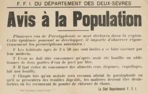 « F.F.I. du Département des DEUX-SÈVRES. » Avis à la Population (Fin 1944) : « Plusieurs cas de Paratyphoïde se sont déclarés dans la région. Cette épidémie pouvant se développer, il importe d’observer rigoureusement les prescriptions suivantes : 1° se faire Vacciner 2° Bouillir l’eau avec 2 gouttes d’eau de javel par litre. 3° Évitez de consommer des aliments crus...» - Affiche (32 x 50) – État B