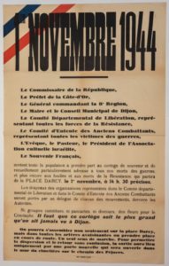 (LIBÉRATION DE LA CÔTE D'OR) «1ER NOVEMBRE 1944 - Invitation de la population du Département de la CÔTE D'OR à prendre part au cortège de souvenir et de recueillement...Le Général Commandant la 8ème Région; Le préfet de la Côte d'Or, Le Comité départemental de Libération, représentant toutes les forces de la Résistance, L'évêque, le Pasteur, le Président de l'Association cultuelle Israélite... Il faut que ce cortège soit le plus grand qu'on ait jamais vu à DIJON...» - Imp. Jobard Dijon - Affiche (100 x 62) - État A