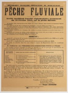 Préfecture de SEINE-ET-OISE - PÊCHE FLUVIALE – Arrêté modifiant l’arrêté réglementaire permanent du 18 Février 1942, sur la pêche fluviale. (Saumon, truite, brochet, écrevisse, grenouille.) – Versailles 17 Décembre 1945 – Affiche (41 x 30) Etat B