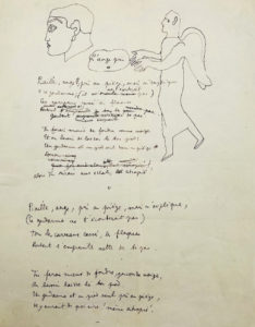 Beau manuscrit de deux versions d'un même poème, le premier jet et la mise au net, illustré de 2 dessins : un ange et un visage de profil.