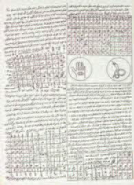 [Calligraphie] Feuillet de prières talismaniques. Ecrit divinatoire avec la main, l’œil et le serpent. Dim. 41x30cm. Encadré.