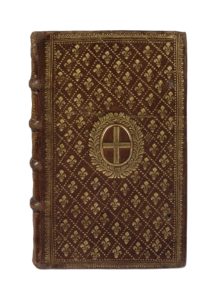 TRÈS JOLIE RELIURE PROVENÇALE ornée d'un semé de fleurs de lis, AUX ARMES DE LA VILLE DE MARSEILLE. Les reliures de cette ville qui recouvrent des livres donnés en prix sont habituellement beaucoup plus simples que celles-ci.