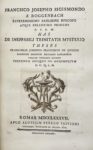 De ineffabili Trinitatis mysterio Theses praenobilis Iosephus Franciscus de Gugger patritius Helvetus diocaesis Lausanensis. Rome, Luigi Perego Salvioni, 1787. Grand in-4 (285 x 207 mm). 7 gravures sur cuivre : vignette au titre, 2 lettres ornées, bandeau signé p. 11 représentant la Trinité, 3 bandeaux cul-de-lampe. Veau fauve à grand décor doré, armes dorées d'un cardinal, tranches dorées (Reliure de l'époque). Thèse romaine de théologie de François Joseph de Gugger, d'une noble famille de Lausanne (patritius Helvetus diocaesis Lausanensis), dédiée au prince-évêque de Bâle, Joseph de Roggenbach.