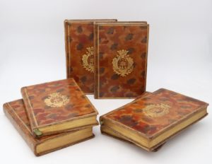 Fables choisies. Paris, chez l’auteur, 1765-75 ; 6 vol. in-8° (195 x 121 mm), veau marbré polychrome, dos lisses ornés, filets et armes sur les plats, dent. int. et tranches dorées (Reliures de l’époque).Luxueuse édition entièrement gravée (texte et figures).