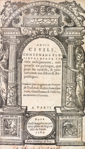 Advis civils contenans plusieurs beaux et utils enseignemens, tant pour la vie politique, que pour les conseils, et gouvernemens des Estats & Republiques. Paris, pour Abel l'Angelier, 1584. In-8 (169 x 99 mm), veau olive, dos à nerfs orné de fleurons dorés, décor à la Duseuil sur les plats (Relié vers 1860). Première édition française. Beau titre dans un portique.