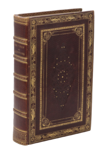 Œuvres complètes de La Fontaine, précédées de l'éloge de l'auteur, par Chamfort. Nouvelle édition ornée d'un portrait et de douze gravures. Paris, Igonette, 1826. In-8, (208 x 132 mm), portrait en frontispice, 12 pl. h.t. Maroquin violet, décor doré et à froid, plaque centrale ponctuée de points d'or dans un double encadrement, dos à nerfs, coupes ornées, contreplat et garde volante de moire verte, dentelle intérieure, tranches dorées (Reliure de l’époque).Edition illustrée d'un portrait de La Fontaine et de 12 planches hors texte gravées d'après Devéria.