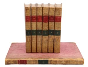 Tache dans la marge sup des 3 derniers feuillets du tome I ; mouillure en pied et dans la marge des pl. 36 et 37. Épidermures à deux plats ; petite tache au dos débordant sur le plat sup. du tome 4 ; deux petites taches au plat sup du tome 6.