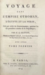 Voyage dans l'Empire Othoman, l'Égypte et la Perse, fait par ordre du Gouvernement, pendant les six premières années de la République - IDEM. Atlas pour servir au voyage dans l'Empire Othoman, l'Egypte et la Perse. Paris, H. Agasse, an 9 [1801]-1807. 6 vol. in-8 (200 x 125 mm). Veau raciné, dos long à décor doré, et un atlas in-folio (322 x 250 mm) en demi-reliure uniforme, plats de papier marbré (Reliure de l'époque).Première édition in-8, parue la même année que l'édition in-4. "OUVRAGE TRÈS ESTIMÉ ET RARE AVEC L'ATLAS" (Chadenat). Guillaume Antoine Olivier (1756-1814), médecin et entomologue réputé, fut envoyé par le gouvernement français en Perse en 1792. Il séjourna longtemps à Constantinople puis se rendit en Égypte par l'Asie Mineure. Au cours de ce voyage qui dura six ans, il rassembla une collection de spécimens d'histoire naturelle considérable (aujourd'hui conservée au Muséum national d'histoire naturelle de Paris). Atlas bien complet des trois livraisons réunissant cinquante belles planches, cartes, plans, vues, costumes, figures d'histoire naturelle (dont plusieurs doubles ou dépl.).
