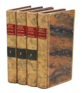 Voyage aux Indes orientales. Traduit de l'italien par M***, avec les observations de MM. Anquetil du Perron, J.R. Forster et Silvestre de Sacy. Paris, Tourneisen fils, 1808. 3 vol. in-8 (199 x 121 mm). Veau raciné, encadrement doré, dos lisse orné genre grotesque (Reliure de l’époque). ÉDITION ORIGINALE DE LA TRADUCTION (éd. orig. en italien, 1796), publiée sous la direction d'Anquetil du Perron et ensuite de Silvestre de Sacy avec leurs commentaires et ceux de J.R. Forster. Le carme déchaussé Paulin (1748-1806), historien et orientaliste, professeur au collège De Propaganda Fidei de Rome, fut envoyé comme missionnaire au Malabar en 1776 où il étudia le sanskrit. Il fut l'un des premiers à avoir établi le lien entre cette langue et les langues indo-européennes.