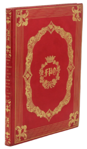 AU ROI et déclaration générale de la COUR DES COMPTES sur les comptes de l’année 1838. Paris, Imprimerie royale, avril 1840. In-4 (290 x 223 mm). Maroquin rouge à long grain à grand décor doré, chiffre au centre des plats, dos lisse orné, tranches dorées (Reliure de l’époque).TRÈS BEL EXEMPLAIRE AUX ARMES DE FERDINAND-PHILIPPE, DUC D’ORLÉANS (1810-1842), LE TRÈS AIMÉ ET POPULAIRE FILS AÎNÉ DE LOUIS-PHILIPPE, qui mourut accidentellement deux ans plus tard. « Jamais la mort d’un homme n’a causé un deuil aussi général. C’est une chose remarquable qu’en France, où la Révolution n’a pas encore discontinué de fermenter, l’amour d’un prince ait pu jeter de si profondes racines et se manifester de façon aussi touchante. Non seulement la bourgeoisie qui plaçait toutes ses espérances dans le jeune prince, mais aussi les classes inférieures regrettent sa perte » (Henri Heine).