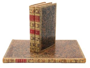 Voyage aux Indes orientales, pendant les années 1802, 1803, 1804, 1805 et 1806, contenant la description du Cap de Bonne- Espérance, des Iles de France, Bonaparte, Java, Banca et de la ville de Batavia ; des observations sur le commerce et les productions de leurs pays, sur les mœurs et les usages de leurs habitans ; la campagne du Comte-Amiral de Linois dans les mers de l'Inde et à la côte de Sumatra ; des remarques sur l'attaque et la défense de Colombo dans l'île de Ceylan lors de sa reddition aux Anglais ; enfin un vocabulaire des langues française et malaise. Paris, Arthus Bertrand, 1810. 2 vol. in-8 (200 x 125 mm). Veau marbré à décor doré, grecque entourant le plat, dos lisse à décor doré, tranches dorées, et un atlas in-folio (335 x 240 mm) en reliure uniforme, tranches naturelles (Reliure de l'époque)."This work is AN ACCOUNT OF THE TERRITORIES IN THE INDIAN OCEAN AND EAST INDIES UNDER FRENCH CONTROL IN 1810, written by Charles-François Tombe, a major in the French engineering corps in Batavia. This includes accounts of Mauritius, Reunion, and Java, including Batavia. The two-volumed account is accompanied by an atlas featuring engraved maps, plans, portraits and views" (National Museum of Singapore).