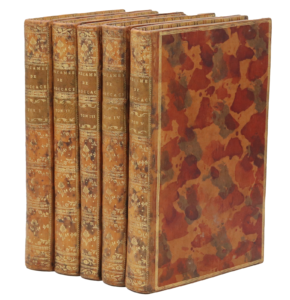 1757-1761. 5 volumes in-8, veau porphyre, triple filet doré, dos lisse orné, dentelle intérieure, tranches dorées (Reliure de l'époque).« Un des livres illustrés les plus réussis de tout le xviiie siècle », selon Cohen.