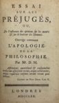 [HOLBACH (Baron d')] — Essai sur les préjugés, ou de l’influence des opinions sur les mœurs et sur le bonheur des hommes. Ouvrage contenant l’Apologie de la philosophie, par Mr D. M. Londres [Amsterdam], s.n. [Marc-Michel R