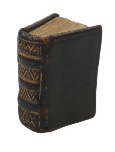 Minuscule (44 x 32 mm) de [87] ff. sign. a-k8 [l1-2] [o3-7] à 14 lignes (justification : 36 x 25 mm) ; maroquin brun, dos orné, coupes ornées, tranches dorées (Reliure du XVIIIe siècle).Rarissime livre d’heures miniature imprimé en rouge et noir et orné de onze bois gravés à pleine page.