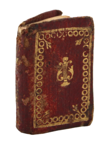 Paris, Marcilly, [1810]. In-64 (28 x 20 mm), maroquin rouge, roulette d'annelets, fleurons aux angles et lyre dorée au centre, dos muet orné d'une roulette dorée (Reliure de l'époque).Almanach minuscule orné de 12 gravures à pleine page, accompagnant des chansons et un calendrier. Le même almanach existe pour l'année 1811.