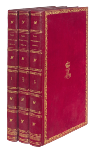 Parme, Bodoni, 1794. 3 volumes in-folio, maroquin rouge, roulette florale dorée, chiffre couronné au centre, dos lisse orné, non rogné (Reliure de l'époque).Somptueuse édition typographique, imprimée sur beau papier vélin par Giambattista Bodoni. Elle est dédiée au roi Charles IV d’Espagne.