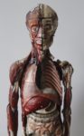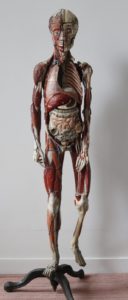 Mannequin anatomique (environ 120 cm) en papier mâché dans des tons de jaune, orange et carnation, fixé à un pied tripode en fonte marqué : Ets du Dr Auzoux, France. Rare spécimen de modèle anatomique du Docteur Auzoux, dont le procédé a révolutionné l’enseignement de l’anatomie et des sciences naturelles.