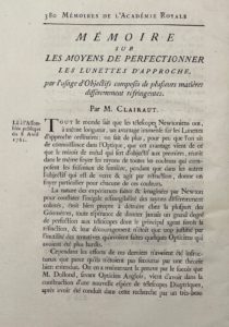 CLAIRAUT (Alexis-Claude) — Mémoires sur les moyens de perfectionner les lunettes d'approche, par l'usage d'objectifs composés de plusieurs matières différemment réfringentes. [Paris, Imprimerie royale, 1762-1764].