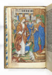 — Avec 16 grandes gravures sur bois (et sur métal ?) et 40 petites gravures sur bois d’après les modèles du Maître des Très Petites Heures d’Anne de Bretagne et Jean Pichore — Format in-4, 98 ff. [de 100] non chiffrés [collation : sig. [que]8, aa8, b8, c8, d6 (manquent sig. d7 et d8), e4, f8, g8, h8, i4, A8, [B]8 (cahier sans signature)], C4., [a]8 (cahier sans signature)], feuillets précédés et suivis d’une garde de papier et de deux gardes de parchemin, marque typographique d’Antoine Vérard au titre, rehaussée et placée dans un encadrement architecturé gravé, impression en caractères gothiques, jusque 32 lignes par page, réglure à l’encre rouge pâle, initiales à l’or liquide sur fonds bleu ou rouge (1 à 3 lignes de hauteur), bout-de-lignes en rouge et bleu avec décor à l’or liquide, gravures rehaussées en couleur inscrites dans des encadrements architecturés gravés et rehaussés (coloris d’époque).