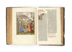 Celle-ci, imprimée en caractères gothiques sur double colonne, est illustrée d’environ 140 gravures sur bois dont 2 à pleine page, copiées sur celles de la célèbre Bible de Nicolo Malermi publiée par Ragazzo à Venise en 1490.