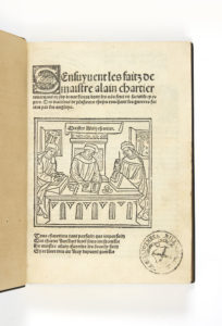 ÉDITION D’UNE TRÈS GRANDE RARETÉ des œuvres d’Alain Chartier, secrétaire de Charles VII, qui comprend, outre Le Courtier, le Livre des quatre dames relatant l'histoire de quatre femmes ayant perdu leur mari à la bataille d’Azincourt.