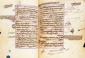 page, rédigé à l’encre noire. Le texte, rédigé de plusieurs mains, est partiellement encadré de lets noirs, avec de nombreuses annotations liminaires, marginales et sur les contreplats. Restaurations sommaires. Les feuillets 96-135 et 138-139, manquants, ont été restitué sur papier diérencié par d’autres mains. Cette restitution et les annotations à calligraphie variée, attestent, ici, qu’il s’agit d’un manuscrit utilisé par plusieurs tolbas à diérentes époques. Reliure amateur avec motifs à froid. Dim. 23 cm.