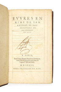 Exemplaire entièrement rubriqué à l’encre sépia, titre réglé et rubriqué, bien complet du feuillet du privilège (lequel fut accordé à Baïf le 26 juillet 1571 pour l'ensemble de ses œuvres) et de la marque d’imprimeur qui manquent souvent (ils sont placés dans cet exemplaire à la fin).