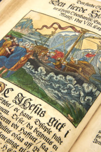 L’évangéliaire est orné d’un titre en rouge et noir, des armoiries peintes de Chistoper VALEKENDORP, de nombreuses initiales rubriquées en rouge, jaune et vert, et de près de 70 gravures sur bois à mi-page relatant la vie du christ. Ces figures sont signées du monogramme CE et l’une d’elles porte la date de 1561. Elles sont ici magnifiquement coloriées à l’époque avec rehauts d’or.