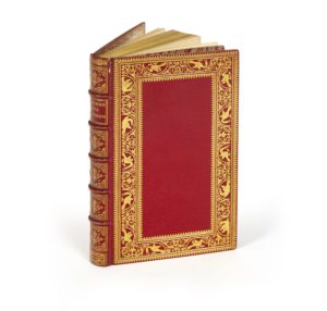 Paris, chez Jean Richer, 1586. — 2 ouvrages en 1 volume in-12 (141 x 80 mm) de 124 ff. ; 23 ff. — Maroquin rouge, dentelle dorée « au pélican » sur les plats, dos à nerfs orné, large encadrement intérieur orné de multiples roulettes et filets dorés, tranches dorées sur marbrure (Chambolle-Duru).