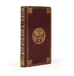 doré en encadrement des plats avec grands fleurons d’angle dorés, armes au centre, dos à nerfs orné, roulette dorée sur les coupes et les chasses, tranches dorées. (reliure de l’époque).
