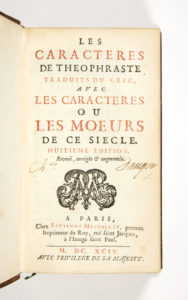 LA BRUYÈRE, Jean de. — Les caractères de Theophraste traduits du grec, avec les caractères ou les mœurs de ce siècle. — A Paris, Chez Estienne Michallet, 1694. — In-12 (172 x 100 mm) de [16] ff., 716, xliv pp. [4] ff. — Maroquin rouge,...