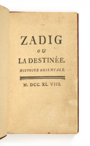 VOLTAIRE. — Zadig ou la destinée. — Histoire Orientale. — S.l.n.n. [Paris et Nancy, Prault et Leseure], 1748. — Petit in-12 (148 x 95 mm) de [1] f., ix pp., [1] p., 195 pp., maroquin rouge, dos à nerfs, double filet doré sur les coupes,...