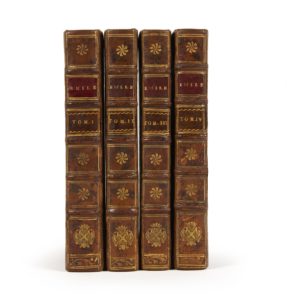 (privilège et errata) ; [2] ff., 407 pp. ; [2 ] ff., 384 pp., [1] f. blanc ; [2] ff., 455 pp. — Veau marbré havane, filet à froid sur les plats, dos à nerfs ornés, armoiries en queue, filet or sur les coupes, tranches rouges (reliure de l’époque).