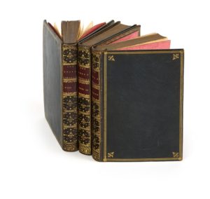 x 128 mm) de [2] ff., 443 pp. ; [2] ff., 464 pp. ; [2] ff., 459 pp. — Maroquin bleu, triple filet doré sur les plats, dos lisse orné, pièces de titre et de tomaison, coupes filetées, roulette intérieure dorée, doublures et contregardes de tabis vieux rose, tranches dorées (reliure de l’époque).