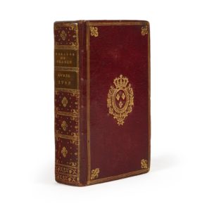 au centre, dos à nerfs orné, dentelle intérieure, doublure et gardes de tabis bleu, tranches dorées (reliure de l’époque).