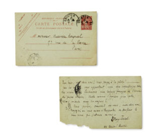 – Carte. [Quimper ?], 30 septembre (?) 1911. 1 p. in-12 (8,8 x 13,9 cm), cachet du 1er octobre 1911.