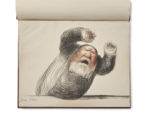 Un dessin original signé du caricaturiste Jean Veber (1868-1928) représentant Jean Jaurès. On y voit le tribun prononcer un discours, le visage rouge, la bouche ouverte, les bras levés, le ventre appuyé à une tribune (26,2 x 34,3 cm, crayon noir, fusain et sanguine ; papier un peu gondolé).