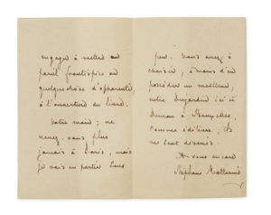 Intéressante lettre autographe portant sur la plaquette que prépare le jeune Calixte Rachet (pseudonyme de Pierre Hachet-Souplet) sur Mallarmé et Lycophron, rencontre entre deux poètes hermétiques. Cette plaquette paraîtra sous le titre À l’écart, chez Auguste Ghio en 1889, illustrée d’un portrait-frontispice de Mallarmé par Pille. C’est le « premier livre jamais consacré à Mallarmé » (B. Marchal, 1998). Mallarmé lui fait ici un certain nombre de suggestions éditoriales :