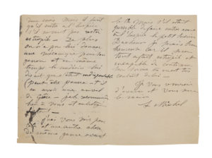 « Il faut avant de rentrer en cage (pour le bon plaisir des Derléans [?]) que je vous demande le grand service de faire entrer à l’hospice mon cousin (le petit Dacheux) à qui vous avez bien voulu faire avoir sa dispense d’âge. Son genou étant de plus en plus malade on l’envoie en congé de deux mois, mais il faut qu’il entre à l’hospice s’il ne veut pas rester estropié. »