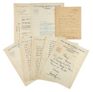 – 1 LAS de Marcel Pagnol adressée à René Pagnol, discutant du prix du matériel du studio et détaillant l’avancée du tournage : « Il me reste à tourner quelques bricoles : course dans la rue, passages en voiture, et quelques plans de raccord. »