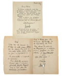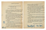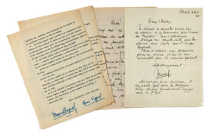 Ensemble de deux lettres autographes signées de Marcel Pagnol et un accord dactylographié signé par Marcel et René Pagnol portant sur le film La Fille du puisatier. Réalisé entre février et août 1940, le film est empreint de l’atmosphère et des préoccupations de la « drôle de guerre ». Il reproduit in extenso le discours du maréchal Pétain, accueilli avec tristesse tant par les personnages que par les spectateurs.