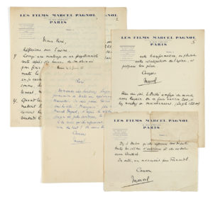 PAGNOL (Marcel) — Ensemble de 3 lettres autographes signées autour des films Regain et Le Gendre de Monsieur Poirier.